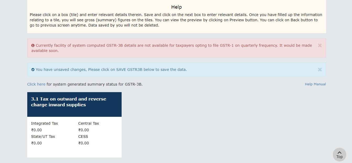 Further if you look at the below mentioned image you will see that this facility is still not available for taxpayers opting to file GSTR 1 on quarterly frequency. However practically you can still download system generated GSTR 3B but you won’t be able to find taxable value of outward supply as GSTR 1 is still not filed.