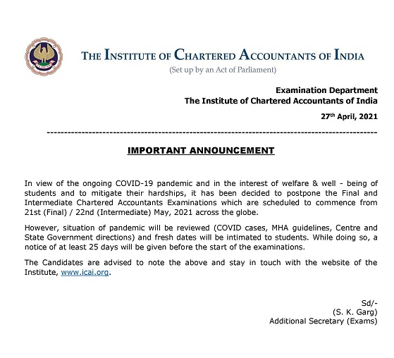 ICAI postpones CA final and Intermediate exam for an indefinite period looking at the current situation of pandemic which was scheduled to be held in May 2021.