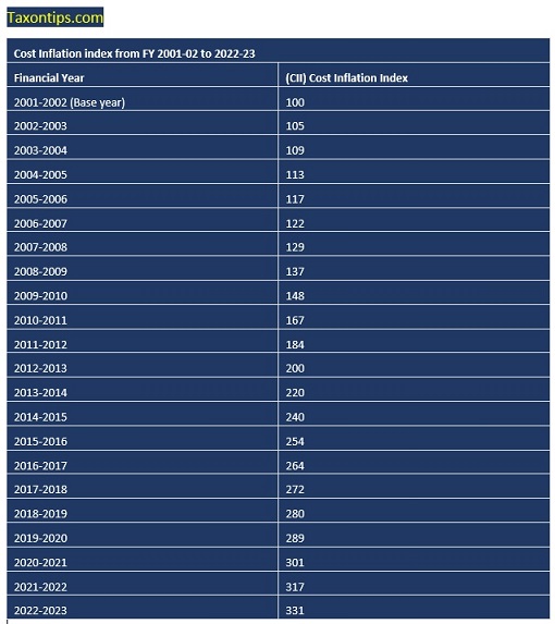Cost inflation index has been announced for F.Y. 2022-23 at 331 and for previous FY 2021-22 it was 317.