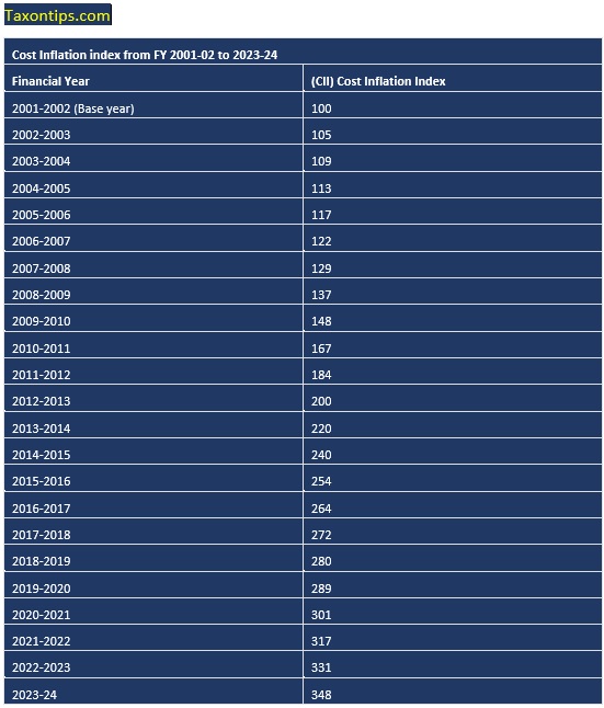 Cost inflation index has been announced for F.Y. 2023-24 at 348 and for previous FY 2022-23 it was 331.