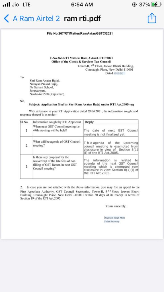 Further, a person had made an application under RTI to know the date and agenda of next GST council meeting. His RTI was answered on 13.05.2021 and till then date of next GST council meeting was not announced and it was also mentioned that disclosing agenda of GST council meeting is exempt under section 8(1)(i) of the RTI Act, 2005.