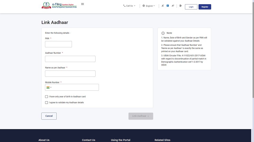 Weblink to Link Aadhar and PAN: Income Tax Portal, Government of India Link Aadhar Page