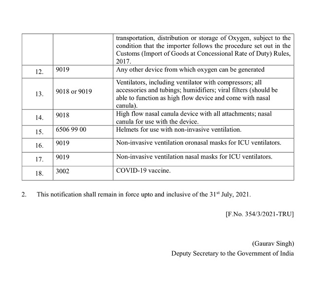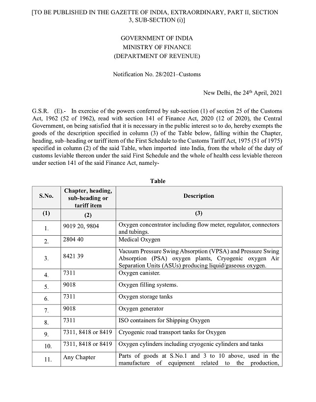 In the current scenario of increasing number of patients the factories of India are not having full capacity to manufacture adequate oxygen and hence to boost production of oxygen, central government has now exempted custom duty on oxygen, machinery used to produce oxygen, ventilators related equipment and covid vaccine.