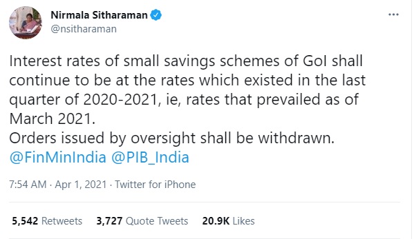 As soon as the news went out people were not very happy with this news in the new financial year and looking at the feedback our Finance minister made a tweet in the morning and mentioned that the Interest rates shall remain unchanged as were in the last quarter and that the “order was issued by oversight“. The tweet is as under: