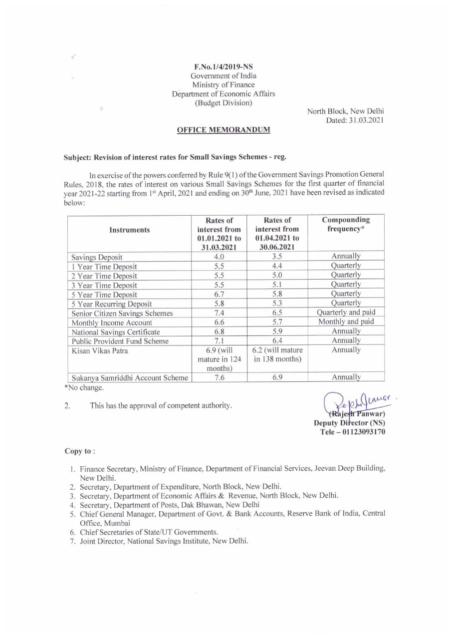 Yesterday Ministry of Finance has issued an office memorandum wherein rates of various saving scheme were reduced for quarter 01.04.2021 to 30.06.2021 as compared to previous quarter.