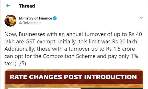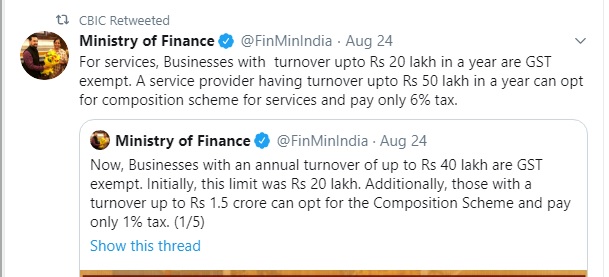 Now looking at the above tweet many people thought that limit has been increased for service providers and limit for goods was already increased to Rs. 40 lakh already an year ago and the tweet said that the “businesses” turnover limit which was Rs. 20 lakh has been increased to Rs. 40 lakh.
