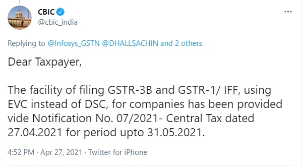 “Dear Taxpayer, The facility of filing GSTR-3B and GSTR-1/ IFF, using EVC instead of DSC, for companies has been provided vide Notification No. 07/2021- Central Tax dated 27.04.2021 for period upto 31.05.2021.”
