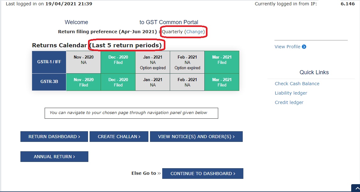 Similarly Dashboard also provides information for changing the option of filing quarterly or monthly return and and one can change the same also from the dashboard itself.