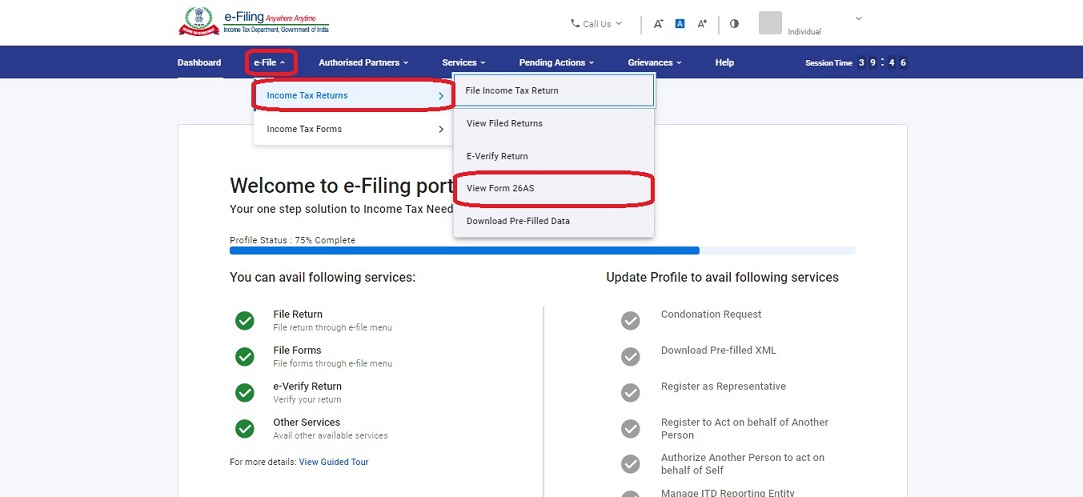 Once you see the menu bar you need to click on e-file -> Income Tax return -> View Form 26AS as shown in the image below.