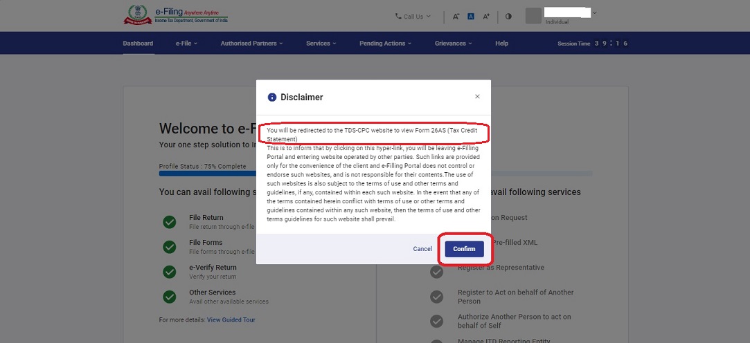 Once you click on View Form 26AS you will see a pop-up which states that you will be redirected to TDS-CPC website and there you need to click Confirm.