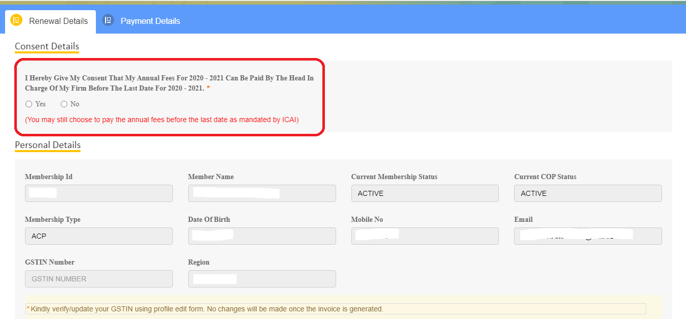 Next you would be first ask to give consent to the head in charge of your firm if you are registered as a partner or paid assistant of a firm. As now ICAI has enabled bulk payment system where head of a firm can make bulk payment for all members of his ICAI registered with him firm in one go. However if no payment is made till last date you can still make your individual payment.