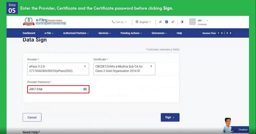 After providing all the above details you need to click on Sign and you will receive a popup that DSC has been registered successfully.