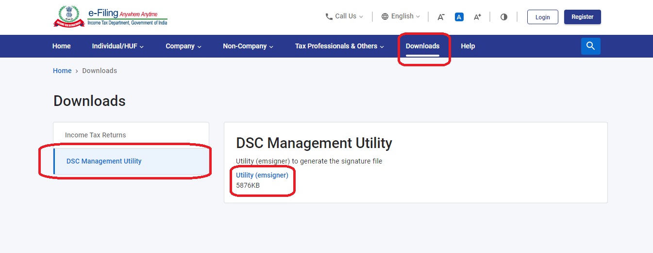 To register one would require the “emsigner software” which is used by Tin-NSDL, GST and various other websites as compared to the Java Based DSC utility which was used before. To download the software you can visit download section of the website available on the Home Page as can be seen in below image: