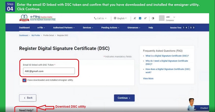 As soon as you click on “Register DSC” you will see a window from where you can also download the emsigner software if you haven’t already downloaded.