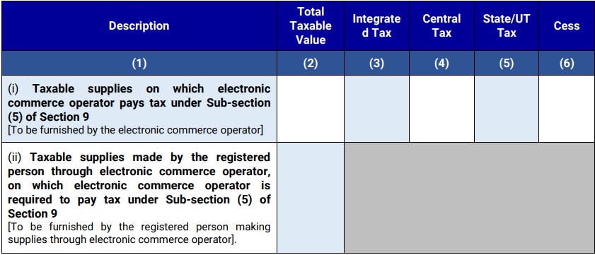 3. An ECO is required to report supplies made u/s 9(5) in Table 3.1.1(i) of GSTR-3B and shall not include such supplies in Table 3.1(a) of GSTR-3B. The applicable tax on such supplies shall be paid by ECO in Table 3.1.1(i) of GSTR-3B in cash only and not by ITC.