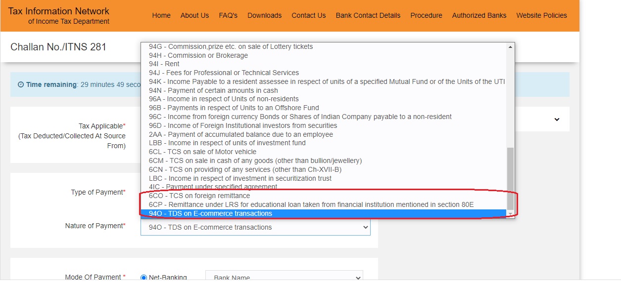 while making payment under sec CR-TCS on sale of goods we are facing problem. After filling all data in form 281 at the time of making payment “Invalid nature of payment” message is showing and it is not going to bank site. What to do? please reply.