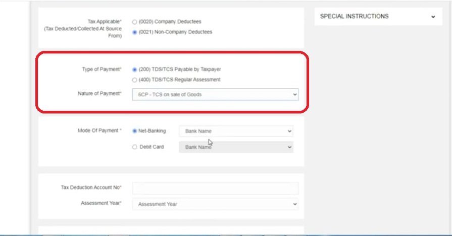 As of now no challan is available to make payment of TCS collected on sale of goods. If you visit Tin-NSDL website which is used to make tax payment you won’t find an option to deposit TCS collected on sale of goods under nature of payment.