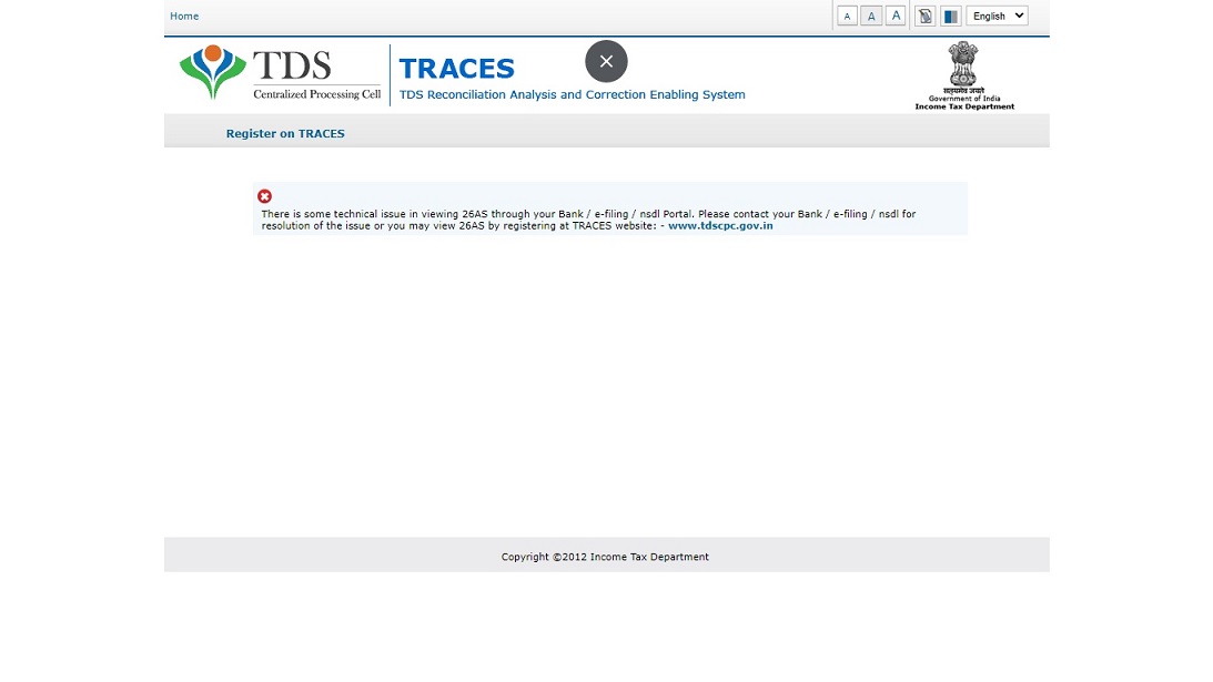 “There is some technical error in viewing 26AS through Bank/ e-filing/ nsdl portal. Please contact your Bank/ e-filing/ nsdl for resolution of the issue or you may view 26AS by registering at TRACES website:-”
