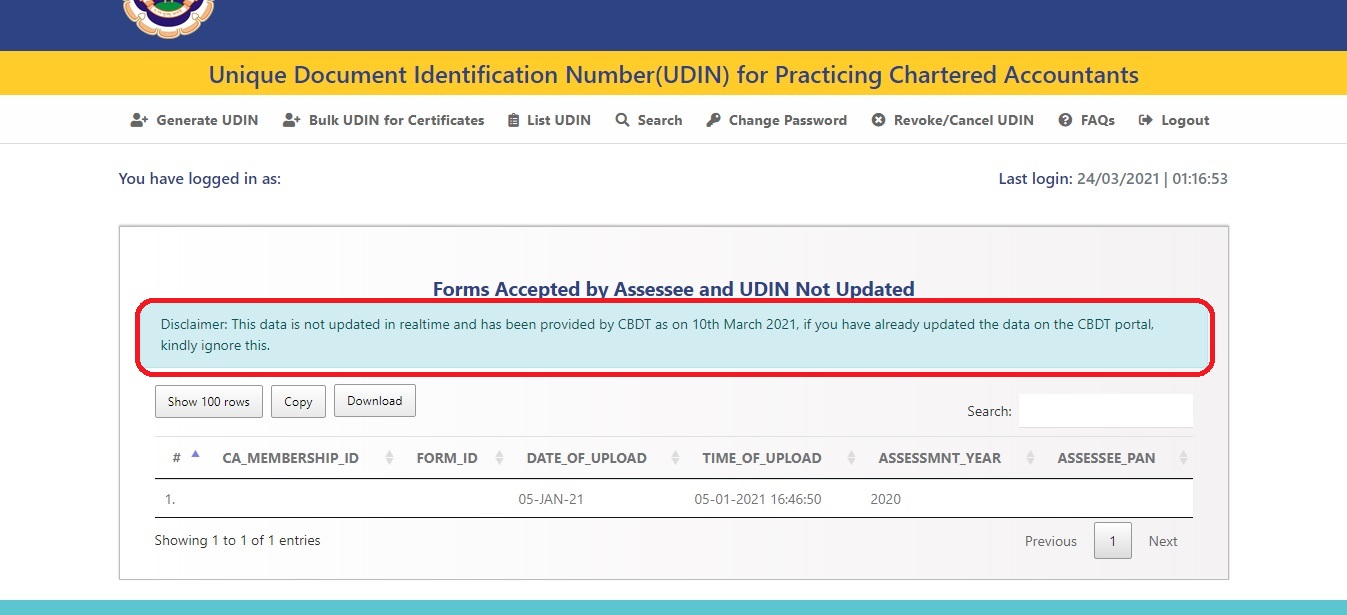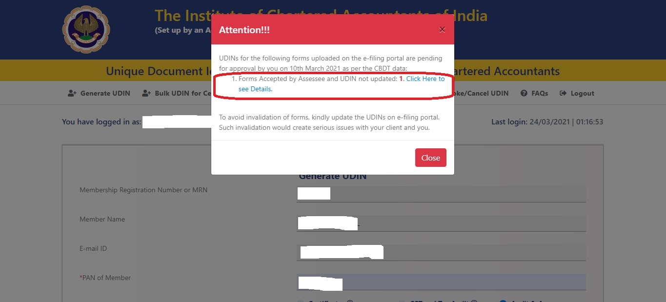 However, now CBDT has shared such information with ICAI and same is available on UDIN website and once you login to UDIN website you will see a pop up as below if any of your issued form is not validated.