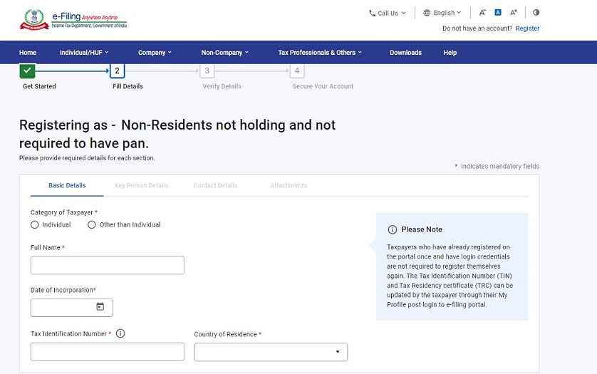While registering Income tax portal might ask details of attach such as Certificate of incorporation, TRC etc. and also a digital signature of authorized person in India. Hence, non-resident could keep such details handy while registering on e-filing portal.