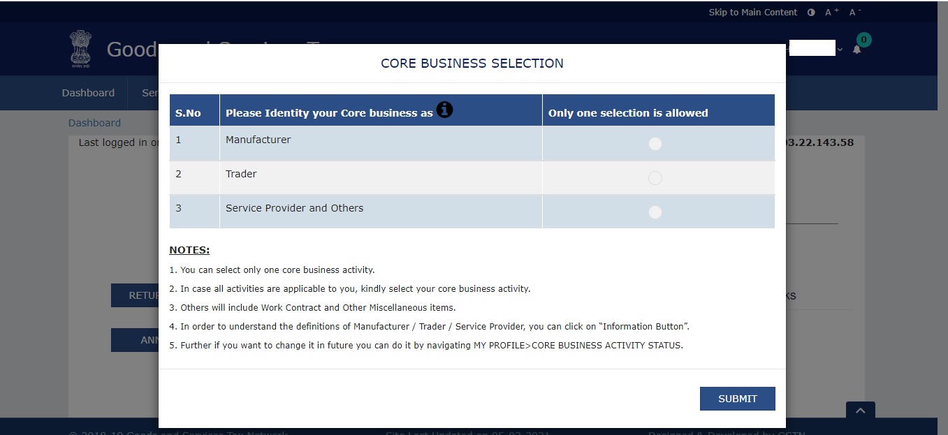 GST website gets updated every few days and now they have come up with another update where the taxpayer is required to choose the one core business activity of the GST number before login.