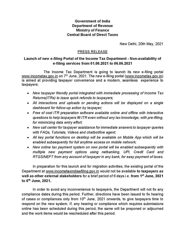 Also an announcement was made regarding launch of new e-filing website and for which e-filing website will not be available for use from 01.06.2021 to 06.06.2021.