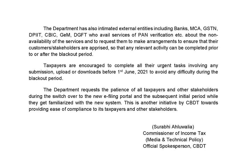 Income tax department has also informed all departments such as GST, DGFT etc who use e-filing website for PAN verification that website shall not be available between 01.06.2021 to 06.06.2021 and that they make some arrangements so that their stakeholder’s don’t suffer.