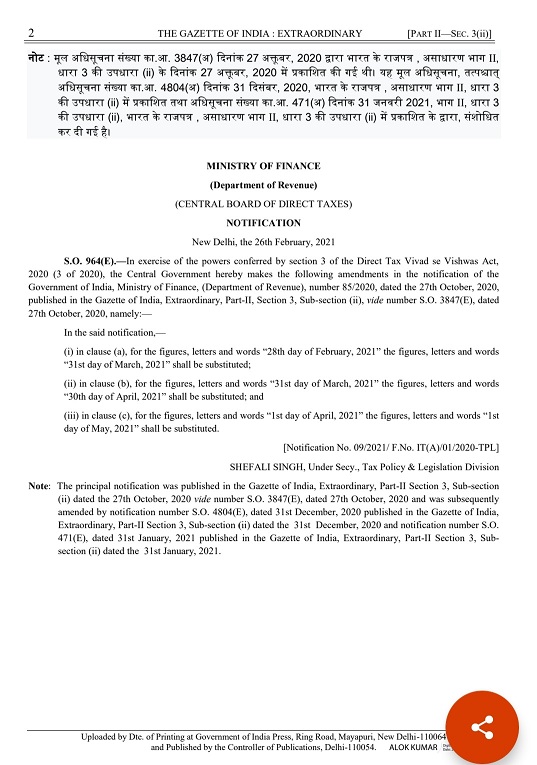 Notification 9/2021 has extended due date for filing of application under Vivad se vishwas act, 2020 from 28.02.2021 to 31.03.2021 and due date for payment of tax without interest has been extended to 30.04.2021 from 31.03.2021.