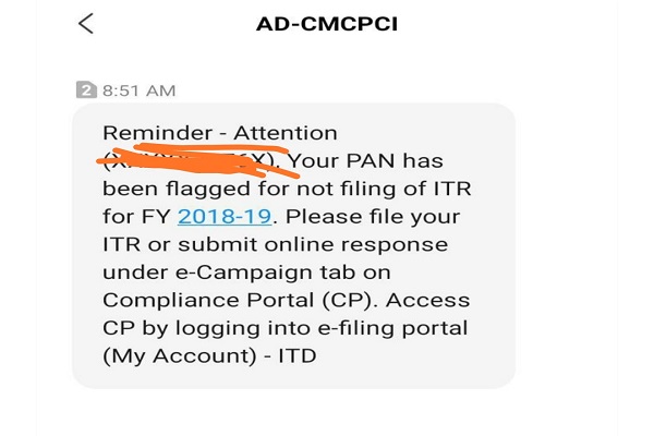 As we know 30.09.2020 is the last date to file return of income for FY 2018-19 and therefore Income Tax department is running a campaign where they send message and e-mail to people those who have done a few high value transaction but have not filed their return of income.